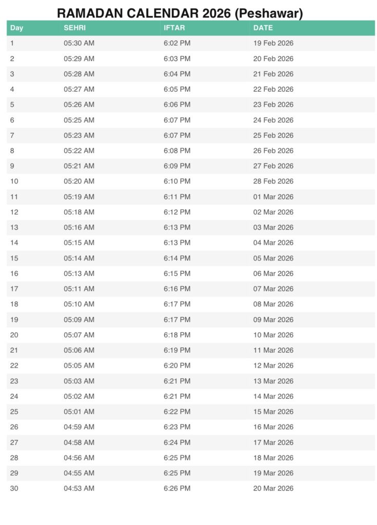 PESHAWAR RAMADAN CALENDAR 2026