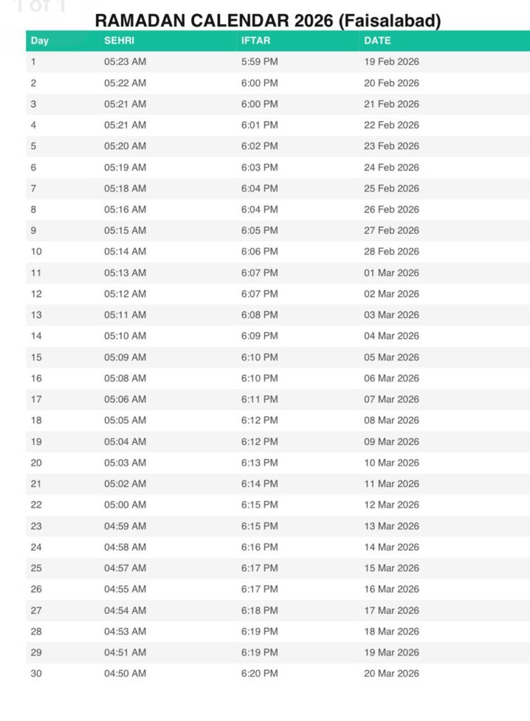 FAISALABAD RAMADAN CALENDAR 2026